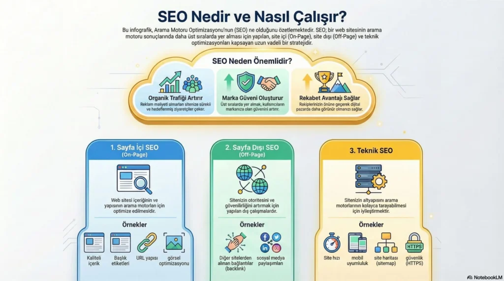 - Technical SEO (Teknik): Web sitesinin teknik altyapısının arama motorları tarafından kolayca taranabilir ve anlaşılabilir olması için yapılan optimizasyonlardır.